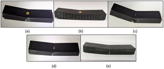 Sample parts after flexural test: (a) type I.a, (b) type I.b, (c) type II, (d) type III, (e) blank.