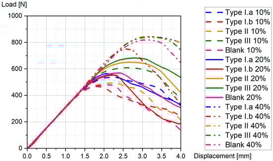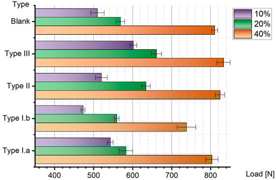 The ultimate strength results of all the samples are given in Figure 12. The average strength of the blank samples with 10% infill is 510 N, with 20% infill it is 569 N, and with 40% infill it is 810 N. For 10% infill samples, the standard deviation is 4%. The consistency in the results increases with the infill ratio. The standard deviation is 2% for 20% infill parts and 1% for 40% infill parts.