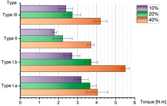 Torque tests were conducted to determine the maximum torque each design can handle in the case of tightening screws, and the results are presented in Figure 13. The ultimate torque strength of type I.a samples with 10% infill is 3.2 Nm, for samples with 20% infill it is 3.66 Nm, and for samples with 40% infill it is 4.04 Nm, with an average of 12 samples each. Type I.b samples with 40% infill show the best results in terms of the torque test, with an average strength of 5.05 Nm. Samples with 10% have 2.71 Nm torque strength, and samples with 40% infill have 3.71 Nm torque strength. Type II samples show the weakest design for the torque test, with 1.79 Nm for 10% infill samples, 2.21 Nm for 20% infill samples, and 3.7 Nm for 40% infill samples. The results of the torque test of the type III samples are 2.39 Nm for 10% infill samples, 2.73 Nm for 20% infill samples, and 4.21 Nm for 40% infill samples.