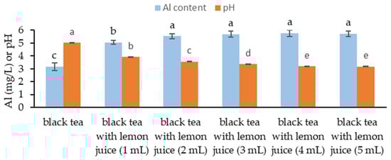 Mean and SD pH value and aluminum concentration (mg/L) in black leaf tea infusions depending on the volume of lemon juice added during brewing. Different letters (a, b, c, etc.) show a significant difference with p < 0.05.