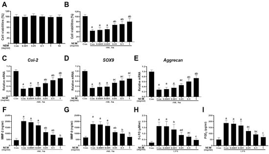 We isolated chondrocytes from the AC of a total of 30 Sprague–Dawley rats (6-week-old males; OrientBio, Seoul, Republic of Korea), following the methods previously described [10]. Briefly, the knee joint cartilage was rinsed with phosphate-buffered saline and then finely minced into approximately 1–3 mm3 pieces. The cartilage tissue was initially digested for 0.5 h using 0.2% pronase (Sigma-Aldrich, St. Louis, MO, USA), followed by a 4 h digestion with 0.1% collagenase (Sigma-Adrich, USA) at 37 °C. After isolating individual cells through brief centrifugation, we cultured them in Dulbecco’s modified Eagle’s medium supplemented with an antibiotic–antimycotic solution (containing 100 U/mL penicillin, 100 mg/mL streptomycin, and 0.25 mg/mL amphotericin B; Life Technologies, Carlsbad, CA, USA). The medium was refreshed every 2 days, and the cells were incubated at 37 °C in a humidified atmosphere with 5% CO2 using a CO2 incubator. For this experiment, only cells within the first five passages were used. Following that, the cells were seeded onto a 24-well plate at different densities: 2 × 104 cells/well for assessing cell viability and for measuring 5-lipoxygenase (5-LPO) activity and PGE2 levels; 5 × 104 cells/well for assessing MMP levels; and 5 × 106 cells/well for gene expression analysis. The cells were cultured overnight before being treated with NEM in five different concentrations (0.0001, 0.001, 0.01, 0.1, and 1 mg/mL) in a culture medium containing 2% fetal bovine serum for a duration of 24 h. We used LPS (50 μg/mL; Sigma-Aldrich, USA) to elicit inflammatory responses in primary cultured articular chondrocytes from rats, and recombinant human interleukin-1 alpha (rhIL-1α, 5 ng/mL; eBioscience, San Diego, CA, USA) to induce degradation and cytotoxicity, in line with previously established methods [11,28]. For the biochemical analysis of 5-LPO and PGE2, cell culture supernatants were collected.