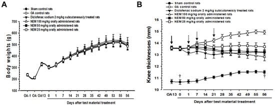 Changes in body weight and knee thickness in vivo. (A) Body weight changes. (B) Knee thickness changes. Values are expressed as mean ± SD in 10 rats. After 13 days from OA surgery, knee thickness significantly increased in the OA model (p < 0.01) compared with that in the sham (arrow). However, it significantly decreased (p < 0.01 or p < 0.05) in rats from day 1 after the initial subcutaneous treatment of diclofenac sodium (2 mg/kg), from day 7 after the initial oral administration of NEM at 100 and 50 mg/kg, and from day 21 after the initial oral administration of NEM at 25 mg/kg (dotted arrows). OA13 means at day 13 after OA surgery, 0 means at the start of administration, 14 means at postoperative day 14, and 56 means day 56 after the initiation of test material treatment and at sacrifice. All animals were overnight fasted before the first test material treatment and the sacrifice (†).