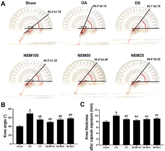 To assess knee joint stiffness reduction by NEM, we measured the thickness of the knee joint capsule exposed to the surrounding tissue and then evaluated the maximum extension angle of the joint after all treatments (Figure 3). The OA group showed a significantly increased maximum knee extension angle compared with the sham, but the DS and NEM treatments significantly inhibited the maximum knee extension angle (Figure 3A,B). In assessing joint capsule thickness, NEM significantly inhibited the increase in capsule thickness induced by OA surgery in a concentration-dependent manner, similar to DS (Figure 3C).