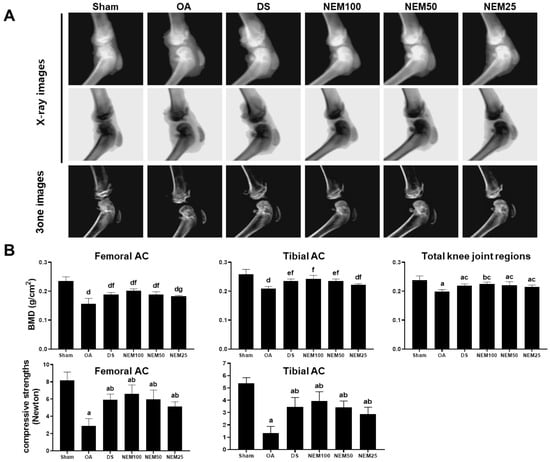 We assessed the BMD in the AC using live dual-energy X-ray absorptiometry (DEXA) images and then measured the AC’s comprehensive strength. In the OA group, DEXA image analysis revealed noticeable edematous changes in the knee joint and erosive signs in the femoral and tibial AC (Figure 4A). Meanwhile, focal BMD was significantly decreased in the entire knee joint, femur, and tibia joint surface areas (Figure 4B). However, these signs were alleviated in the DS, NEM100, and NEM50 groups. Given that BMD affects bone strength, we additionally evaluated the compressive strength of both types of AC. The compressive strength of the femoral and tibial AC was decreased in the OA model group compared with that in the sham group but was significantly increased in the DS and NEM treatment groups compared with the OA group (Figure 4B). In particular, BMD and compressive strength were higher in the AC of the NEM100 group than in the DS group.