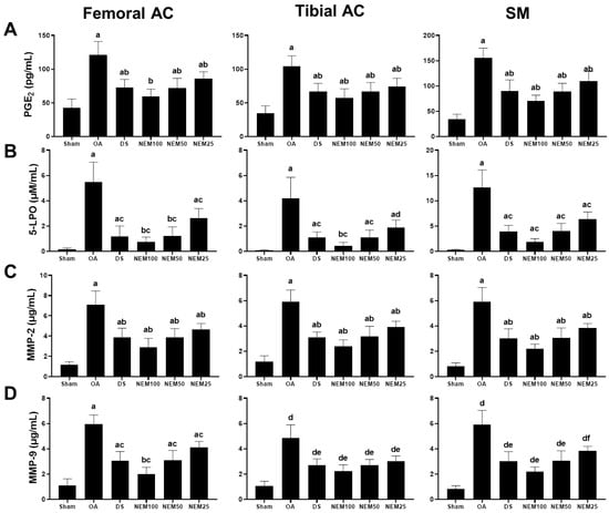The levels of the inflammatory mediators, PGE2 and 5-LPO, and the degradation enzymes, MMP-2 and MMP-9, were assessed in the femoral and tibial AC and SM (Figure 5). The 5-LPO activity and PGE2, MMP-2, and MMP-9 levels in the femoral and tibial AC and SM were found to be increased in the OA group compared with in the sham group. However, they were significantly reduced in the DS and NEM groups compared with the OA group. In particular, NEM100 showed a greater inhibitory effect on these mediators and enzymes than DS.