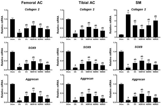 We measured the mRNA expression levels of Col-2 and aggrecan, key components of the cartilage ECM, and SOX9, a transcription factor for cartilage differentiation, in the femoral and tibial AC and SM. The OA group showed decreased expression levels of Col 2, aggrecan, and SOX9 in the femoral and tibial AC compared with the sham group (Figure 6). However, their expression levels were significantly increased in the DS, NEM100, and NEM50 groups compared with in the OA group. Regarding the SM, the expression of aggrecan and Sox9 were decreased, whereas Col-2 expression was significantly increased in the OA group. However, their expression was significantly reversed by the administration of DS, NEM100, and NEM50.