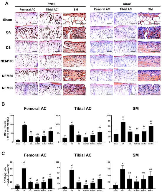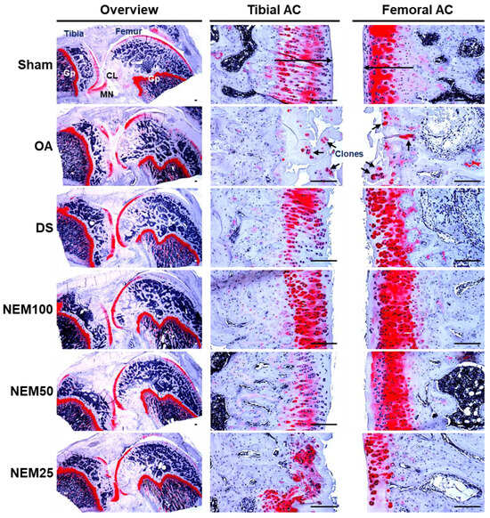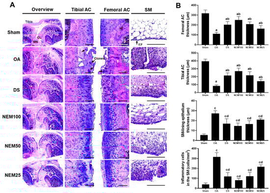The histopathological changes were examined in the AC and SM stained with H&E and SO. After H&E staining, the OA group clearly showed a thin cartilage layer, clonal formation, and severe cartilage damage on the femur and tibia articular surfaces, as well as an increase in the amount of SM-lining epithelium and number of infiltrated inflammatory cells (Figure 7A,B). However, these histopathological changes were improved in the DS and NEM treatment groups. In the surgically induced OA group, the decreased thickness of the femoral and tibial AC increased after DS, NEM100, or NEM50 administration (Figure 7A,B). In particular, the NEM100 group showed a greater increase in the thickness of the AC and a more prominently reduced thickness of the SM-lining epithelium than the DS group.