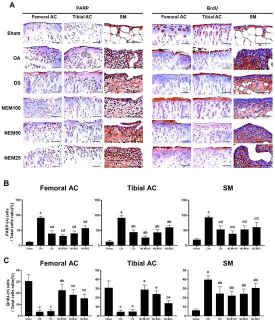 The immune response to BrdU showed differences in the cartilage and synovium in the OA compared with in the sham group. BrdU-immunopositive cells were decreased in the two types of AC of the OA group but were significantly increased in a dose-dependent manner in the NEM group, excluding DS administration. Conversely, the immunoreactive cells in the SM were increased in the OA group compared with in the sham group, but the DS, NEM100, and NEM50 treatments inhibited this increase. Specifically, in the OA model, NEM100 exhibited more significant beneficial effects on anti-inflammation, anti-apoptosis, and chondrogenesis than DS.
