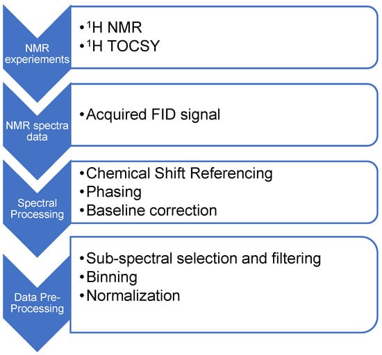The 1H NMR spectrum of petrol is a complex mixture consisting of multiple detectable and overlapping peaks. The position, intensity and width of the peaks of interest significantly impact the quality of the NMR spectrum and its subsequent interpretation. The acquired 1H NMR and 1H TOCSY data were processed with Mestre Nova (version 10.1.0 LITE-SE) software, where different processing parameters were applied to achieve the most efficient dataset. The processing included (1) chemical referencing, (2) phasing, (3) baseline correction, (4) sub-spectral selection and filtering, (5) normalization and (6) binning (Figure 1). The detailed methodology is included in Supplementary Materials.