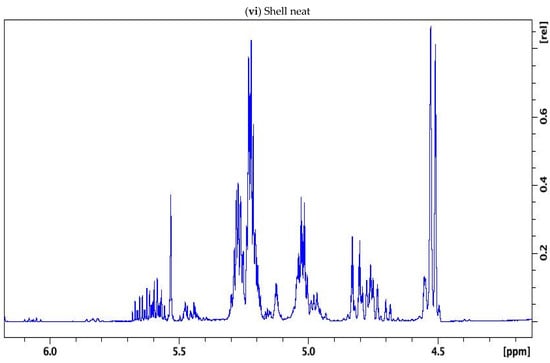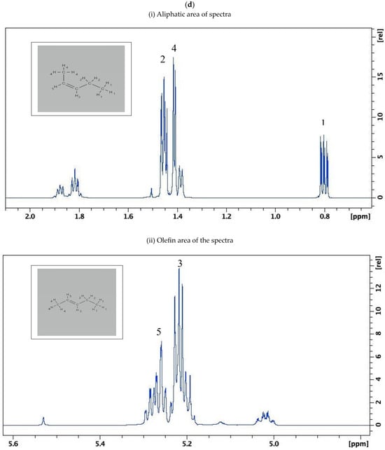 The datasets underwent unsupervised machine learning by applying PCA and a supervised analysis by applying PLS-DA in MetaboAnalyst. PCA was chosen as the explorative tool of the pre-processed data to display any natural groupings. The score plots were a visual representation of the clustering between groups. A loading plot displays how strongly each characteristic influences a principal component. Therefore, PLS-DA was then used for the classification and feature selection of the variables, using cross-validation to select an optimal number of components for classification. The bins that contained important variable information for classification were identified by PLS-DA through the Variation Importance Projection (VIP) score. The VIP score is a measure of a variable’s importance in the PLS-DA model [21]. It summarizes the contribution a variable makes to the model. The VIP score of a variable is calculated as a weighted sum of the squared correlations between the PLS-DA components and the original variable. A statistical analysis was performed exploiting the real-time interactive web-based application MetaboAnalyst. Firstly, the non-targeting approach, considering all the spectral information, was explored for classification purposes, and then the targeting approach was used, where the four sets of olefins were evaluated to achieve better clustering. The dataset from the 1H selTOCSY spectral data was used, which edited out many NMR peaks by filtering out all signals that did not have a component of their spin system in the selective excitation.