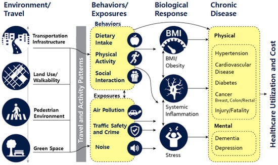 - Frank, L.D.; Iroz-Elardo, N.; MacLeod, K.E.; Hong, A. Pathways from built environment to health: A conceptual framework linking behavior and exposure-based impacts. J. Transp. Health 2019, 12, 319–335. [Google Scholar] [CrossRef]