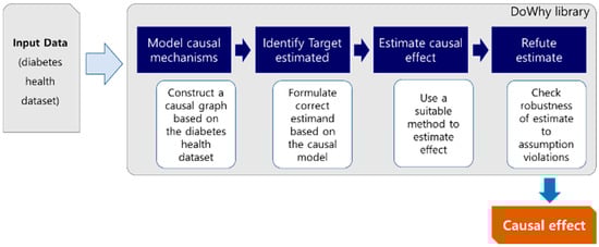 Causal inference based on the DoWhy library can analyze the influence of factors such as stress intervention on diabetes. First, DoWhy is used to develop causal assumptions and graphically represent structural parts based on diabetes health data. Subsequently, the correct estimand is formulated based on the causal model, and a suitable method is used to estimate the effect. Finally, the robustness of estimates to assumption violations is checked using three different methods. Figure 2 shows the research process of the study, and Appendix A shows the code used for causal inference.