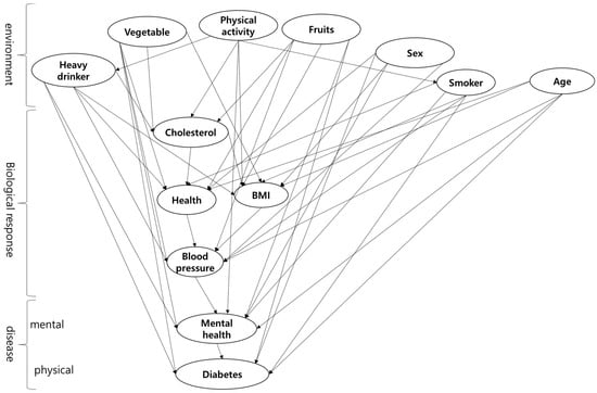 Previous studies on diabetes also identify the various mediate factors that affect diabetes. For example, various studies have demonstrated a link between physical activity, BMI, obesity, and diabetes [10,11,12]. They discussed the importance of exercise as a critical component of diabetes management and explained precautions for people with type 2 diabetes. People need social interaction for physical and mental health. Psychological and physical stress are associated with triggers for the development of type 2 diabetes mellitus (T2D). Chronic stress and obesity form a vicious cycle of metabolic disorders and cause diabetes [13]. Therefore, this study was conducted in order to confirm the influence of mental health on type 2 diabetes, based on causal inference. Based on these studies, we adopted the causal model proposed by Frank et al. [1] in this research.