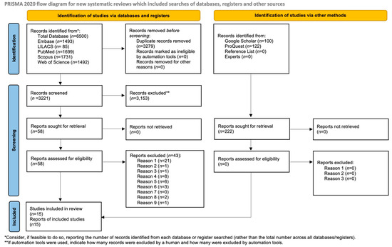From a total of 6500 references identified in the five databases, 3221 were considered. After eliminating duplicate records in phase 1 of study selection, 58 articles went on to phase 2 of full-text reading (Figure 1).