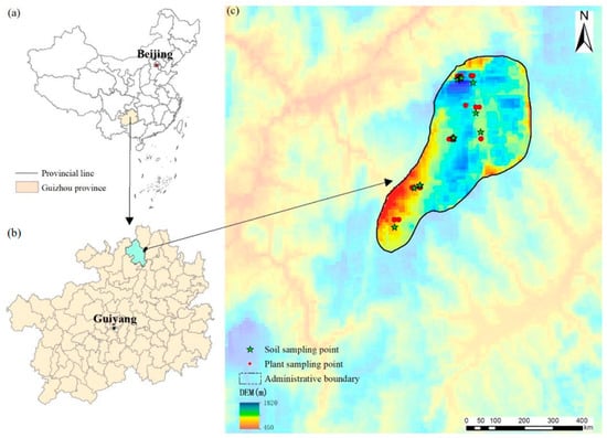 Digital elevation model (DEM) map of sampling points. ((a) Location map of Guizhou in China; (b) Location map of the sampling area in Guizhou; (c) Map of sampling sites in the study area).