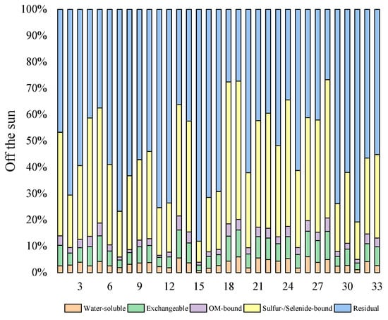 (5) The remaining residue was dried and poured out, scraped from the inner wall, ground well in an agate mortar, weighed, and put into a sachet. Then, 0.05 g of residue was weighed out from the pouch and placed in an ablution tube and ablated with concentrated hydrochloric acid and HNO3 (V1:V2 = 3:1), and the samples were completely digested using a microwave digestion system, followed by cooling and volume adjustment. Regarding the determination of selenium in sequential extracts, it was divided into two categories. One was the sulfide-/selenide-bound and residual Se of the extract, which can be directly diluted and then determined by atomic fluorescence. Meanwhile, the other category included the water-soluble, exchangeable, and organic-matter-bound Se of the extract. For this category, it was necessary to carry out the determination through oxidative reduction. This involved taking 1 mL of the extract and transferring it to a polytetrafluoroethylene beaker. Then, we added 1 mL of HNO3 and 0.5 mL of H2O2 and steamed until the volume reduced to 0.5 mL at 100 °C. Next, we added 0.5 mL of HNO3 and steamed until nearly dry. Afterward, we added 2.5 mL of 1:1 HCl and heated to reduce at 100 °C for 0.5 h. Finally, we transferred the solution to a 25 mL colorimeter tube and determined the selenium content using an atomic fluorescence meter.