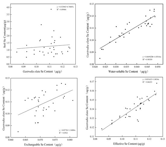 Regarding the correlation analysis between the total amounts of Se in the soil and G. elata (Figure 3) samples, a weak correlation was observed (R = 0.32), indicating that the mechanism of plant Se absorption in the soil is complex and that the Se content of plants does not solely depend on the total amount of Se in the soil.