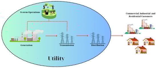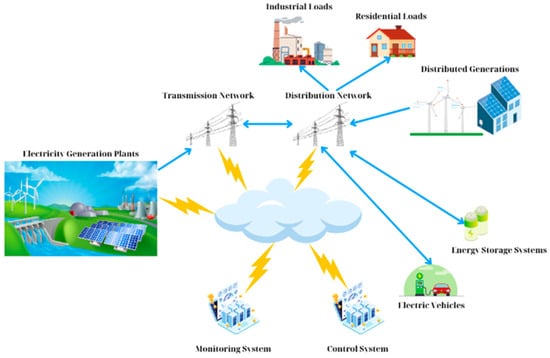 Recent decades have witnessed radical transformations in the electric power industry driven by environmental imperatives and technological advancements. The need for the urgent reduction of CO2 emissions has accelerated the restructuring of the electricity sector [4], leading to the integration of Distributed Energy Resources (DER), Renewable Energy Sources (RES), Energy Storage Systems (ESS) and Information and Communication Technologies (ICT) into Smart Grids (SG). This shift moved the industry away from the traditional vertical models towards more flexible and sustainable energy systems, resulting to an incremental transition of the traditional consumers to prosumers, who actively participate in both the consumption and production of electricity [5,6]. The Smart Grid concept is presented in Figure 2.