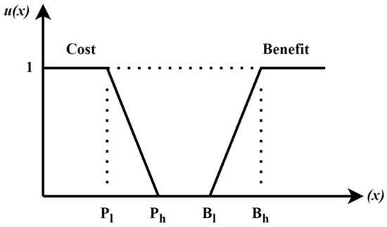- Firstly, an initial offer is made from the first negotiator which can be a buyer or a seller. The other participant can accept the offer ending the process or submit a counteroffer. The counteroffer creation is described as follows: The opponent negotiator evaluates the offer employing a utility function which allocates values to the available options (Equation (1)).In Equation (1), is the overall utility value for the offer and is the utility value assigned to issue . Each utility value is assigned to its corresponding weight, .Some options—the qualitative ones—may be predefined, and can be assigned to certain values in the [0,1] interval-valued q-ROFS, while the quantitative options may have more vague definitions and can be expressed by fuzzy sets and q-ROFS. For example, the option “price” which is common option for both seller and buyer has a diverse significance for them. From the seller’s point of view, the price is expected to lead to a benefit and from the buyer’s perspective the cost is the issue which the price option incorporates. Naturally, the option “benefit” for the seller should be the larger while for the buyer the option “cost” should be the smaller. Moreover, the participants are setting the higher and the lower bounds they are willing to accept. Thus, these bounds are forming the constraints of the problem. The weights of the options as they are set by every participant along with the respective values form the submitted offer. The negotiating agent of the participant is now set. In Figure 3, the utility function of the price issue is shown. Pl and Ph stand for the lower and the higher bounds of the price the buyer is expecting to pay while the Bl and Bh the lower and the higher benefit bounds the seller is expecting to achieve.