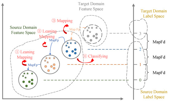 Design Idea. An FSN based on the assumption that features from different domains can be converted to each other as long as a pattern can be found. The design idea comes from the sources shown in Figure 6. Since all labels in the label space of the source domain correspond to the actual working condition, and the load size in the working condition is the domain number, the number is practically meaningful in this scenario. There is a straightforward linear mapping between these numbers, represented as 0, 1, 2, and 3, which are evenly distributed along the number line shown on the right side of Figure 1. Domain numbers 0, 1, and 2 represent the source domains, corresponding to the data generated by the bearing under 0 HorsePower (HP) load, 1 HP load, and 2 HP load, respectively. These data sets belong to three distinct domains, which together comprise the source domain data. Domain number 3 represents the target domain, associated with the data generated by the bearing under 3 HP load. On the left side of Figure 1, these domain numbers are mapped to their respective domain feature spaces. These feature spaces are linearly ordered according to the domain labels, indicating a systematic pattern among them.