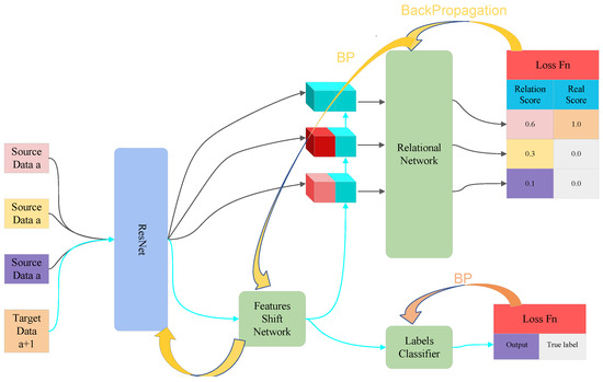 The FSN structure is shown in Figure 7. During training, the input data are organized into the form of 1–9. Specifically, this means that there is one sample from the source domain (a + 1) and nine samples from the source domain (a). These nine samples are derived from 0 to n classifications within domain a, where n denotes the number of classifications in the task. In the actual training, domain a may be domain 0 or 1, and the corresponding domain a + 1 is domain 1 or 2. The data of domain a are changed into features after ResNet, and the extracted features of the data of domain a + 1 have to go through a feature shift network to obtain the shifted output. It is expected that this output can be aligned with the features of the data with the same labels in domain a through the relation module, and the output is the relation of 1 Score. Ultimately, when domain 3 is treated as domain a + 1, then domain 2 is treated as domain a. At this stage, the data from domain 3 are subjected to both feature extraction and feature shifting. Relationship scores are computed by comparing these features with those of each class in domain 2. The class with the highest relationship score is expected to be the true category of the data from the target domain.