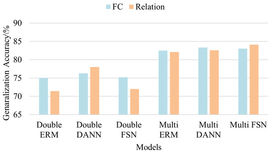 Figure 9 simultaneously shows the effect of each model using the FC classifier’s generalization and the relationship between the generalization effect of the classifier. We can see that the multi-source method is significantly better than the dual-source method, and FSN has the largest performance improvement when moving from dual-source to multi-source domains.