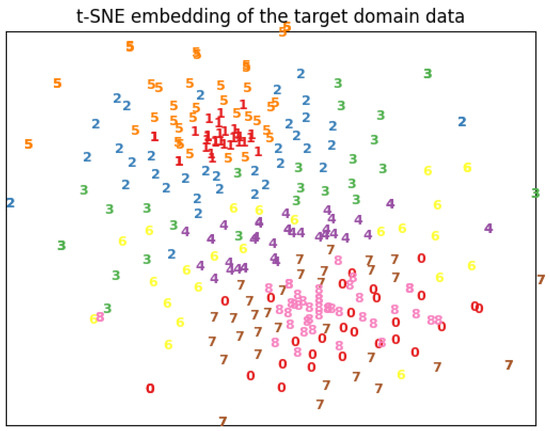 Figure 11 illustrates the use of the t-SNE method for visualizing data distributions. The failure modes are denoted by their corresponding numbers, as listed in Table A1. When the test set data are visualized in a grayscale image format, many data points of the same class cluster together, exhibiting initial signs of locality in the feature space. For example, data points from the same class tend to form coherent groups. Specifically, data associated with faults 1 and 8 show a central and cohesive distribution pattern. However, other fault types exhibit more dispersed distributions. For example, data points for fault 3 are scattered across the upper region of the plot, while fault 2 forms a semi-circular distribution around fault 1. Additionally, faults 7 and 0 display a near-uniform mixed distribution. Notably, in subsequent experiments, faults 1 and 8 achieve 100% classification accuracy when the model is applied to the test set. This high accuracy not only indicates that faults 1 and 8 are particularly distinguishable, but it also underscores the effectiveness of the t-SNE plot in reflecting the underlying data distribution patterns.