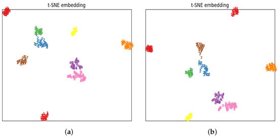 t-SNE method to visualize the data. (a) Model generalization results before shift; (b) model generalization results after using adversarial.
