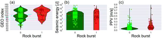 PPV values, calculated based on Formula (1) for individual samples in the database, ranged from about 0.006 m/s to about 0.77 m/s (mean 0.08 m/s). Considering only rock bursts, the calculated PPV ranged from about 0.043 m/s to about 0.77 m/s (mean 0.15 m/s). The distribution of tremor energies and PPVs, with division into rock bursts (1) and cases without damage and destruction in the openings (0), is illustrated using violin plots and presented in Figure 1b and Figure 1c, respectively. The values of the parameters presented in Figure 1a–c for rock bursts and non-destructive tremors were in the similar range. However, a high value of a given parameter does not mean that a rock burst is certain.