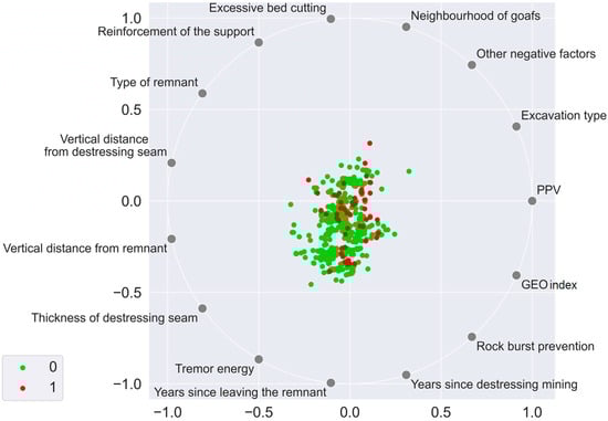 The highest value of the Spearman correlation coefficient was for PPV (0.26), followed by the type of excavation (0.22), and GEO index (0.12). The Spearman correlation coefficient for a neighborhood to goafs, excessive bed cutting, and reinforcement of the support was 0.11. For the remaining nine parameters, the absolute value of the Spearman correlation coefficient did not exceed 0.1. Negligible negative and positive monotonic relationships were found for five and four features, respectively. A RadViz plot was used to illustrate the cases of rock bursts and cases without destruction and damage to mining openings against the background of the distinguished features with normalized values (Figure 2). The RadViz plot enables the graphical presentation of multidimensional data. In this way, it is possible to determine existing regularities, identify clusters of similar objects, and indicate unusual observations. The separateness of the features was visualized this way.