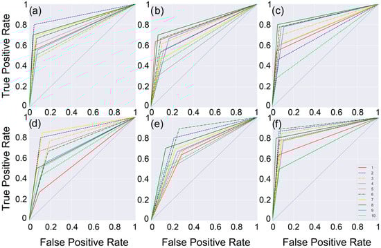 ROC curves for models of selected machine learning algorithms: (a) MLP, (b) AdaBoost, (c) GB, (d) KNN, (e) GNB, (f) ensemble classifier.