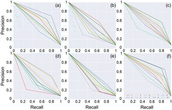 During classification, it is not uncommon to struggle between discovering all the positive cases in the data while reducing the erroneous results. However, it is often a process where a balance is sought between two opposing forces. Models should therefore be characterized by both high recall and precision. Figure 4 shows the precision–recall curves for all trained and tested models, and for all datasets. The more accurate the model, the more the precision–recall curve is shifted toward the upper-right corner. The large area under the curve means both high recall and high precision. In Table 9, the areas under the precision–recall curves are shown.