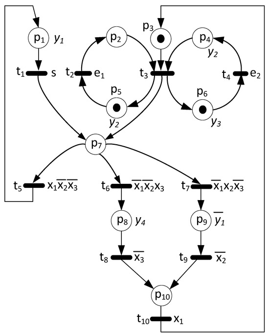 The main benefit of Petri nets is the possibility of easy representation of concurrency, but sequential processes can be expressed naturally and intuitively. Let us explain it by an example. Consider a concurrent control system shown in Figure 2. There are 10 places and transitions in the system specified by an interpreted Petri net . Moreover, there are input binary signals, , and output binary signals assigned to transitions and places, respectively. Let us briefly describe the behaviour of the system. At the beginning, three places are initially marked: This means that three processes are performed concurrently. In particular, operations and are executed (related to places and , respectively), while the third process waits until those operations are finished. The first one ( ) is dependent on input signal . Once this signal becomes active, transition is fired and the token is moved from to . Similarly, input signal allows for firing and moving a token from to . Note that both operations ( , ) are typically concurrent, while they may (but not have to) occur at the same time. Once the system reaches a state with marked places , transition is fired. Note that there are no input signals assigned to , thus it is fired once all its input places contain a token. As the consequence, tokens from all input places of (that is, from places ) are consumed and added to each of its output places: , and . In such a resulting state, three tasks are executed concurrently. Two of them refer to operations and , as it was already described (during the initial marking). The remaining process is related to place . Depending on the combination of input signals , three possible places can be reached by this particular process: (upon firing of ), (when is fired), or (upon firing of ). Note that the input signals here play an essential role and allow for enabling the particular transition. In general, Petri nets are not deterministic, and such a situation is called a conflict [41,43,82]. Such a problem can be easily resolved by application of the input binary signals—this is one of the additional (and huge) benefits of interpreted Petri nets. Finally, the system executes operation (if is fired), ( ), or ( ). The first possibility returns to (once input signal becomes active and transition is fired), while the remaining two eventually lead to the initial state, where place is marked.