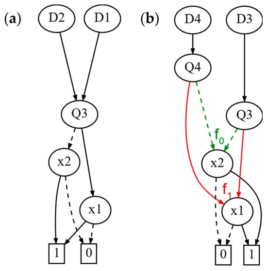 Clearly, the above functions are not equal. Moreover, they correspond to the different pointers in the BDD (Figure 3b). Finally, both functions and have different arguments. However, due to the fact that the system is oscillated by the same clock signal, they can be transformed into the equivalent form.