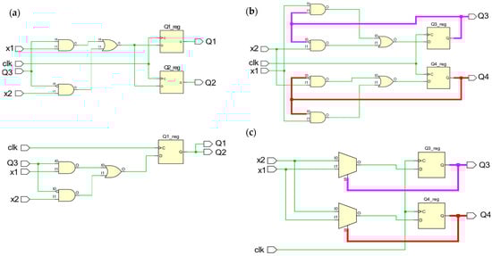 Nevertheless, replacing the mentioned two flip-flops with a single one requires two conditions to be fulfilled. Firstly, their excitation functions ought to be the same. Furthermore, the initial values of both flip-flops must be the same: (which can be easily checked). The replacement of two flip-flops by a single one is shown in Figure 4a.
