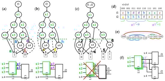The same is immediately visible when using the BDD representation of Boolean functions (Figure 3a). In the computer implementation of libraries for operating on BDD (or more precisely ROBDD), the logical function is a pointer to a structure in the memory (representing a graph node) [89]. The structure contains two pointers to two descendants for the values of the variable 0 and 1. When performing any operation on a BDD, it is checked using a hash table to see if the node already exists in memory, so as not to duplicate it. BDD libraries ensure the canonicity of logical functions, i.e., unambiguity and uniqueness of representation. Checking if two functions are equal is limited to checking if two pointers are equal to each other.