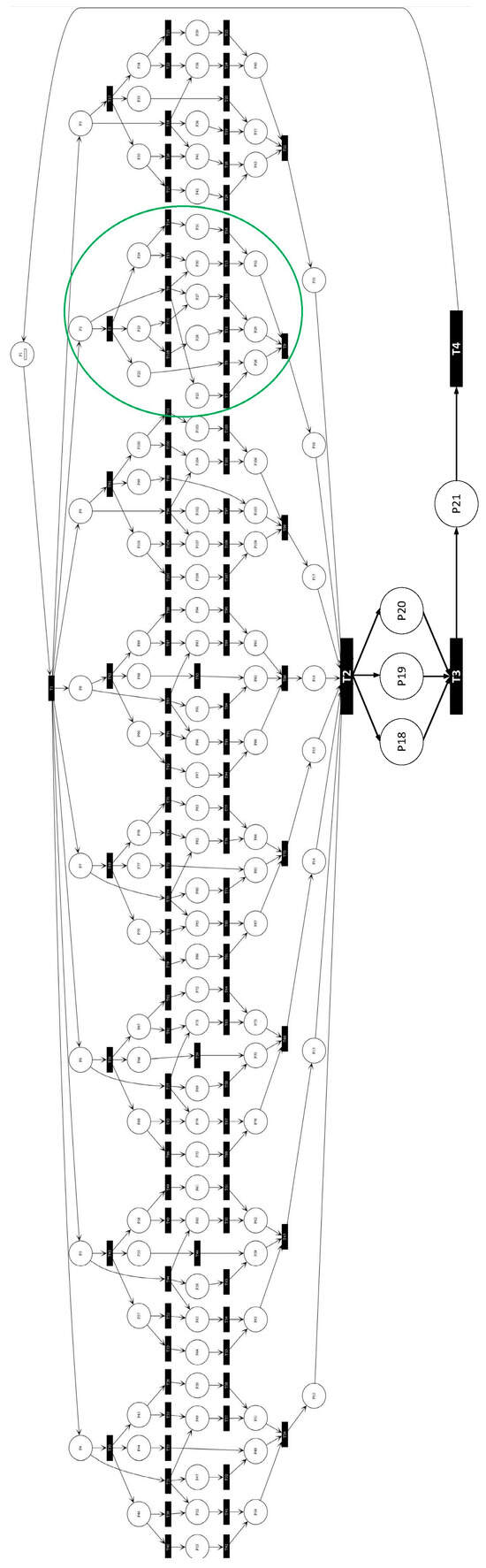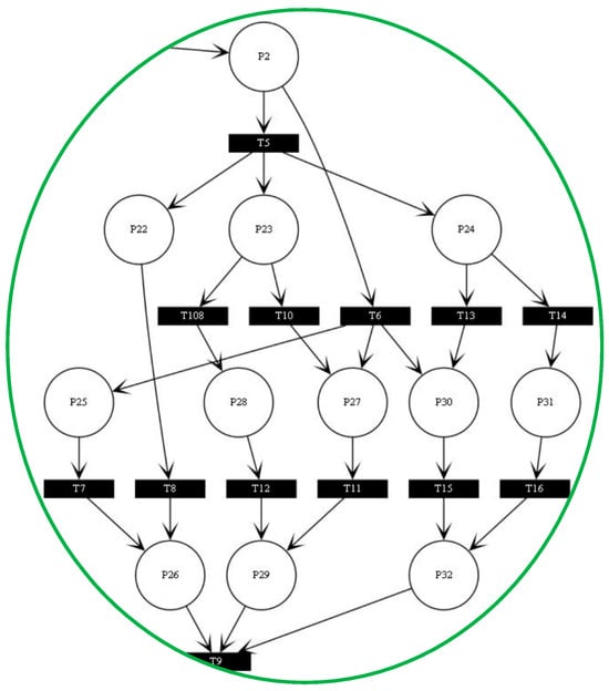 Moving on to the concurrency aspects, it should be emphasized that Petri nets reflect such a relation by their nature [21]. In particular, one or more places can be marked at the same time. It means that operations associated with those places are executed concurrently. This makes Petri nets applicable in many areas of human life, especially including industry applications [22]. For example, they can be found in modern industries, such as resilient manufacturing, where 3D printing techniques are applied [23]. It should also be noted that Petri nets provide a robust means of modeling the intricate interactions and dependencies in such systems, allowing for a detailed examination of their behavior [24].