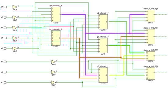 In general, the implementation of the Petri net-based concurrent system within FPGA is a relatively easy process. The modeled system is transformed to the hardware description language (HDL), which is a base for further realization within the FPGA. In short, the functionality of particular places and transitions of a Petri net are translated into the set of equations that are written within the hardware language Verilog or VHDL (Very High Speed Integrated Circuit Hardware Description Language) [44]. Going into detail, each place of a Petri net is assigned to one flip-flop in a sequential circuit [13]. Thus, a set of flip-flops active at the same time reflect the current marking (state) of the system. Similarly, transitions are transformed into logical functions (combinational circuit) [43]. Those functions stimulate flip-flops associated with places. Finally, output signals are directly assigned to the particular places [13,43]. The technique described above is effective (the translated system reflects the model) and relatively easy to perform (the transformation can be conducted automatically), thus it seems to be the most popular nowadays. However, there is an important drawback that refers to the relatively high utilization of hardware resources of an FPGA. As already mentioned, an FPGA consists of LUTs and flip-flops (FFs). Although a single LUT allows for the implementation of any logic function, it is limited to a relatively small number of variables (usually 5–6). This means that larger functions ought to be divided (decomposed) into subfunctions with a small number of variables [45,46,47,48]. Obviously, such a decomposition heavily influences the number of logic blocks used to implement the modeled system. Therefore, the final implementation of the Petri net-based design may drastically increase. Let us now briefly overview the most popular logical function decomposition techniques of systems implemented within an FPGA.