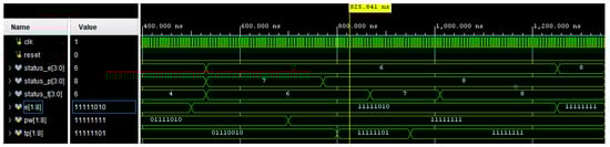 Let us explain this with an example. Assume that at time both flip-flops are initialized with the same value, e.g., . Then, after inserting that into expression (2), we obtain the same functions . Since at the moment the excitation functions of the flip-flops are equal, at the next moment , the Q values remain the same: . Furthermore, if both flip-flops are initialized by value , we obtain , and thus . By repeating the above for every time moment t, it can be noticed that both flip-flops are equivalent.