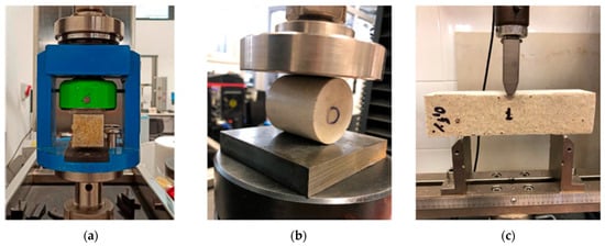 Experimental set-up: (a) compression test (the specimen is located inside a specific joint device as prescribed by the relevant standard); (b) splitting test; (c) three-point bending test.