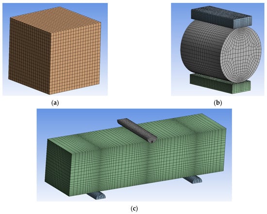 FEM models: (a) compression test; (b) splitting test; (c) three-point bending test.