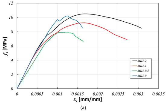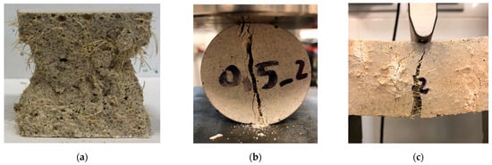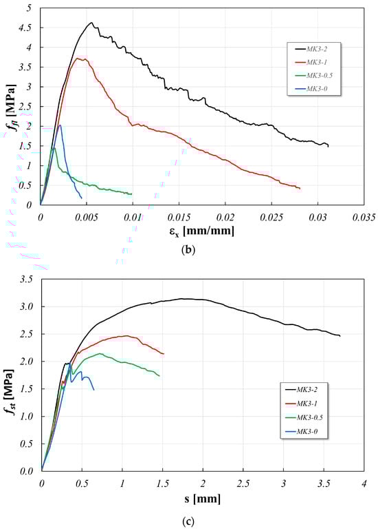 In Figure 3, the obtained results for compression, three-point bending and splitting tests are respectively reported, while in Figure 4, images of one tested specimen are reported for each test. The results sketched in Figure 3 for each test are the mean of those obtained for each sample (three specimens for each test) and allow us to draw the following remarks: (a) in the compression test, the main contribution of the fibers is related to the great increment in the softening phase, which, on the contrary, is limited in the case of specimens without fibers; (b) the ultimate strength increases when comparing the results of no-fiber specimens with those with a 2% of fiber content; (c) for intermediate fiber contents, the results show a decrement of and a limited increment in the yield strength with the fiber content. These results are different from those reported in [45] where, however, the length of the fiber is about 35 mm, 14 times greater than that adopted in the present study, also suggesting a dependency of the compressive strength on the fiber length. It must be noted that in [45], the replacement was performed as a volume fraction, while in the present paper, it was performed in terms of a weight fraction. As a result, the compression Young’ modulus is very close in all the cases except for the case of MK3-05, in which it is lower. The compression results confirm that for this type of loading, the contribution of the fiber content is not meaningful and the behavior is similar. The exception to this remark is the case of 0.5% of which the peculiar behavior should be related to some “defects” in the tested specimens. The reason of these “defects” must be related to the role of the porosity above the fiber’s critical concentration (usually between 0.2% and 2%) that, in the case under examination, is around 0.5% [15]. This aspect will be further investigated in the development of the research. Analogous remarks can be made in the case of the three-point bending test. The fiber content causes a significant increment in the softening phase with respect to the no-fiber content, an important increment in the ultimate strength and a limited increment in the yield strength . Further, it causes the onset of the hardening phase and a huge increment in the softening phase with an important consequence on the energy fracture as it will be described in the following. The analysis of SEM images (which are not reported in the paper only for brevity sake but are available as Supplemental Material) confirms the good bonding between fibers and the matrix for all examined cases. The Young’ modulus has been determined as the slope of the straight line interpolating the experimental results in the range 0.1–0.3 of the strength for both compression and bending tests.