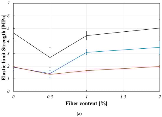 To characterize the dependency of the mechanical behavior of the geopolymer composite on the fiber content yield and ultimate strengths, the Young’ modulus was identified for each batch and each test and plotted vs. the fiber content. In Figure 5, the limit elastic strength and the ultimate ones are respectively reported in terms of mean values and deviations. These results suggest that in the case of the splitting test, the dependency of both the yield and ultimate strength is lowest and that of the three-point bending test is the highest, while in the compression test, the dependency is intermediate. These results are coherent with those reported in [15,27,46]. This peculiar behavior can be ascribed to the presence of fibers, due to which the initiation and extension of cracks of mode I fracture, and potential shear stresses are reduced. This is because once a crack faces a fiber, it demands higher energy of the fracture to pull the fiber out and then propagate [15].