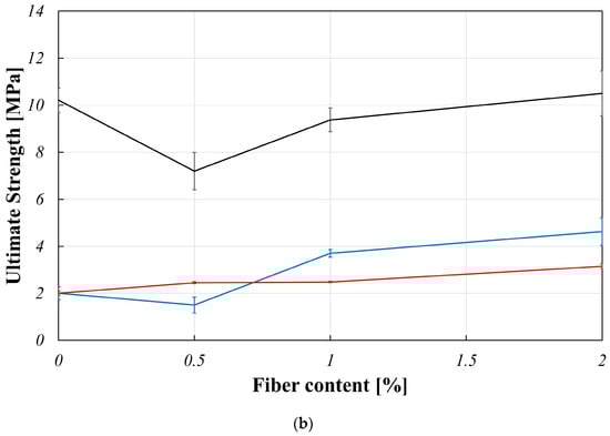 Strength vs. fiber content (black line: compression test; blue line: bending test; red line: splitting test): (a) yield strength; (b) ultimate strength.