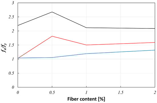 The fundamental role played by the fiber in the mechanical behavior of the material under examination can be further evidenced by examining Figure 6, where, for each mechanical test, the ratio between the ultimate strength and the yield strength is sketched. This ratio indicates the ability of the material to possess a hardening phase. As it is evident from Figure 6, in the case of compression, this ratio is almost independent from the fiber content, while in the case of the splitting test and three-point bending tests, this ratio shows an increment of about 40–60% (depending on the test) with the fiber content, confirming either its fundamental role in the tensile behavior of the material and the results reported in [44] and suggesting that, in this case, the fiber length does not greatly influence the results.