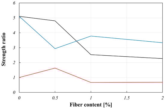 Strength ratio vs. fiber content (black line: ; blue line: ; red line: ).