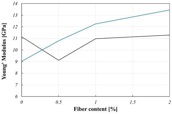 To further evaluate the influence of the fiber content on the mechanical behavior of the material, in Figure 7, the strength ratios , and are sketched versus the fiber content. In all cases, the evolution of the curves is a decreasing one confirming, as reported in [46], that the fibers influence the flexural behavior more than the compressive and splitting ones and that this influence is greater in tensile behavior than in the compressive one. In Figure 8, the Young’ modulus in the case of compression and bending tests is sketched vs. the fiber content. The obtained result confirms the remark already made for Figure 3, i.e., the dependency of the relevant mechanical parameter on the fiber content is higher in the case of the three-point bending test.