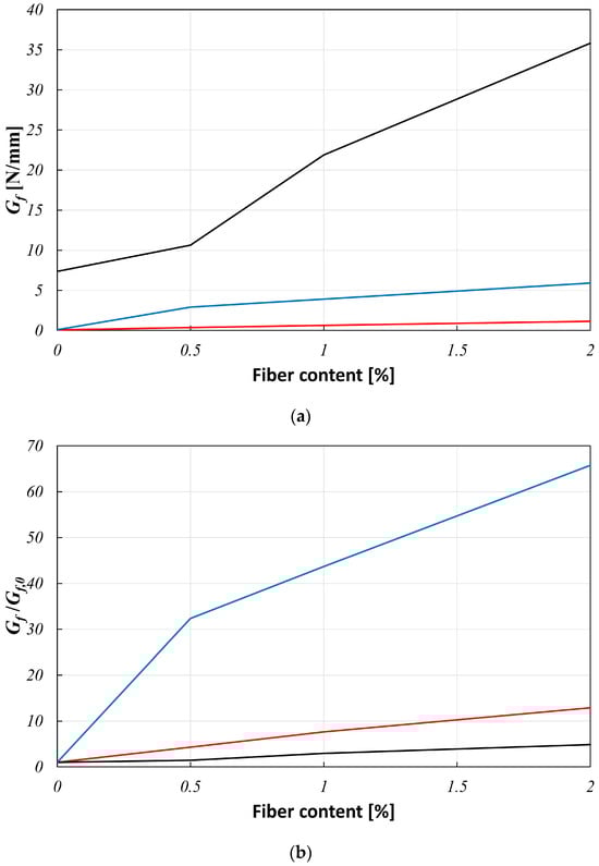Fracture energy vs. fiber content (black line: compression test; red line: splitting test; blue line: bending test); (a) ; (b) .