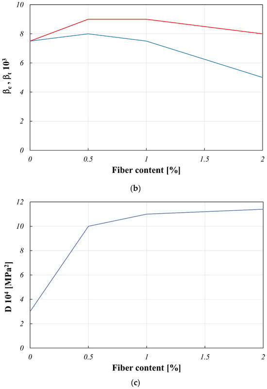 Microplane parameters vs. fiber content: (a) ; (b) (blue line) and (red line); (c) .