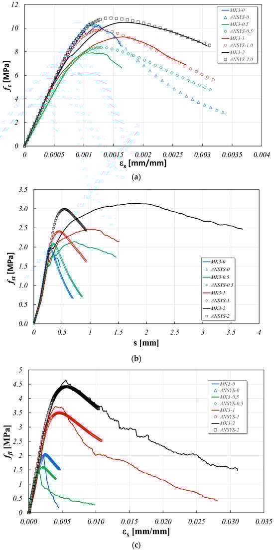 As it has been reported in Section 2.2, the numerical analysis was performed iteratively to reproduce the experimental results. As it is explained in literature about the selected numerical model, all the characterizing parameters interact with each other to give the overall behavior. It follows that the selection of the best parameters of the numerical model is a complex task and, in the present paper, it was performed based on the following criteria: (a) the elastic phase must be reproduced correctly (maximum absolute error equal to 2%); (b) the strength of all the tests must be reproduced with a maximum absolute error equal to 10%; (c) the area under the compression and bending tests must be reproduced with a maximum absolute error equal to 10% and 20%, respectively.